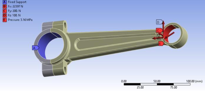 Establishing boundary conditions is an essential and crucialstepinFiniteElementAnalysis(FEA).This process involves defining constraints for the meshed model to simulate real-life scenarios accurately. The boundary conditions encompass fixed support, forces, and pressure that are applied to the model. By specifying these constraints, the analysis can determine the deformation, fatigue, stress, and strain values of the connecting rod whileadhering toacceptabledesignlimits. In the analysis of the connecting rod, a fixed support was applied at the bigger end, which is connected to the crankshaft. Additionally, pressure and forces were exerted at the smaller end, connected to the piston, as illustrated in Figure5.