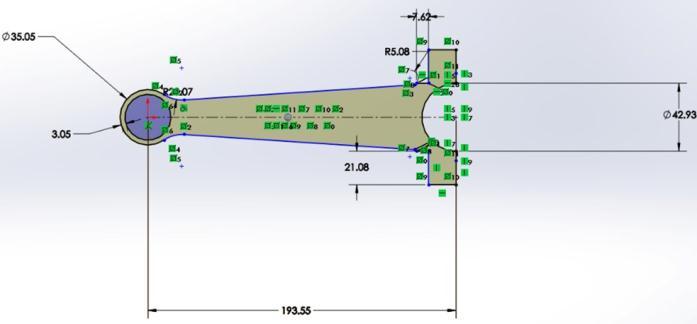In this research, a connecting rod model was designed in SolidWorks 2019 software. The connecting rod was fabricated with a length of 193.55 mm, diameter of the smallerend,35.05mm,andthediameterofthebiggerend, 42.93mm,showninFig-2.