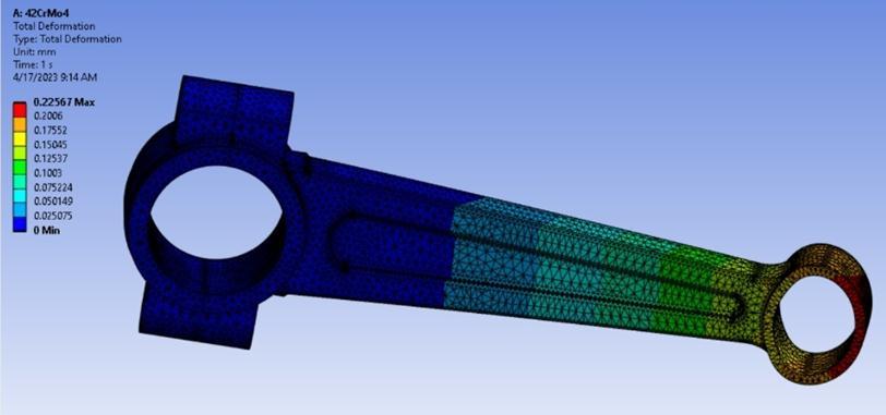 42CrMo4is the secondchoiceforproductionasit hasthe lowest value of total deformation and has a high factor of safetyafterTitaniumalloy.
