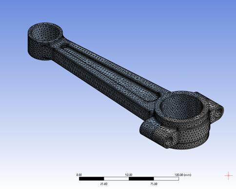 Static analysis involves the meticulous examination of equilibrium conditions exhibited by objects when subjected to external forces. It encompasses both linear andnonlinear approaches, withthelatteraccommodating an extensive array of nonlinear phenomena such as significantdeformations,plasticity,creep,stressstiffening, and contact elements. The current focus pertains specificallytostaticanalysis,acomprehensiveexploration of the effects resulting from sustained loading conditions on a given structure. Notably, this analysis disregards the intricate dynamics introduced by inertia and damping effects inherent in time-varying loads. The primary objective of static analysis lies in the precise determination of essential parameters including displacements, stresses, strains, and forces within structures or components, all of which arise from loads that lack substantial influence from inertia and damping mechanisms. Additionally, the process of meshing, an indispensable aspect of numerical analysis, assumes a significant role. Meshing involves the intricate segmentation of complex geometries or domains into simpler, more manageable elements. This segmentation facilitates enhanced analytical techniques and contributes substantially to the accuracy and efficiency of the overall analysis. To illustrate this concept further, Figure 4 provides a visual representation of intricate mesh details, while Figure 5 demonstrates the process of meshing specifically applied to the connecting rod under investigation.