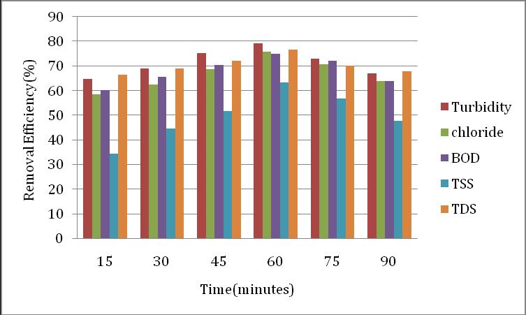 Removal efficiency of BOD was 75% in 60 minutes at depth 40cm and 73.2% for areca husk fiber. Removal efficiency of TDS was 76.67% in at depth 40cm and for arecahuskfiberis73.82%. RemovalefficiencyofTSSwas 63.33%atdepth40cmandforarecahuskfiberis51.11%. Removalefficiencyofchloridewas75.86%atdepth40cm andforarecahuskfiberis64.82%.