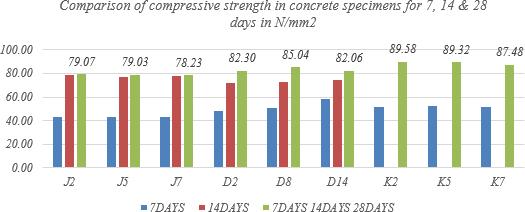 ItwasobservedthatthecompressivestrengthdecreaseswhentheGGBSquantityexceeds35%.AmongthemixesforM70 grade,D8(Cement:62%,Silicafume:8%,GGBS:30%),forM65grade,J5(Cement:57%,Silicafume:8%,GGBS:35%),andfor M75grade,K5(Cement:62%,Silicafume:8%,GGBS:30%)werefoundtobetheoptimalmixes.Nosignificantchangewas observedinflexuralstrengthforanyofthetrialmixes,exceptforaslightincreasewith10%Silicafume.