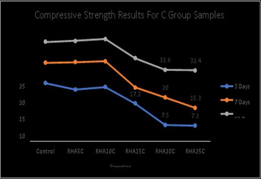 On comparing the results of compressive strength tests corresponding to both groups it was observed that the maximum 28 days compressive strength for group C sampleshavingconstantstandardconsistencywasobtained for10%replacementandhada valueof46.6MPawhereas the maximum 28 days compressive strength for group V sampleshavingvariablestandardconsistencywasobtained for15%replacementandhadavalueof47.4MPaandafter it in both cases there was a downfall in compressive strengths with respect to control sample, The main cause can be that there wasn't enough water for hydration. At replacement levels of 20 and 25 percent, the materials had verylittlebonding,whichmadethemlessworkable.
