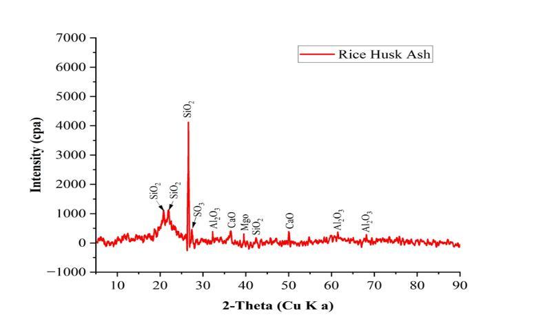 To analyze the chemical structure of materials, XRD Patterns of Rice Husk Ash were plotted. The pointed peaks of graph indicate towards the crystalline nature of Rice Husk Ash. The main peak of Silica (SiO2) was observedshowingthatintensityofsilica isveryhigh in comparisontootherconstituents,alongwithitpeaksof Lime (CaO), Magnesia (MgO), Alumina (Al2O3) were also observed. The silica was observed at different diffractedanglesandwasmainlyobservedintheforms ofcoesite,quartz,andtridymitemineral.