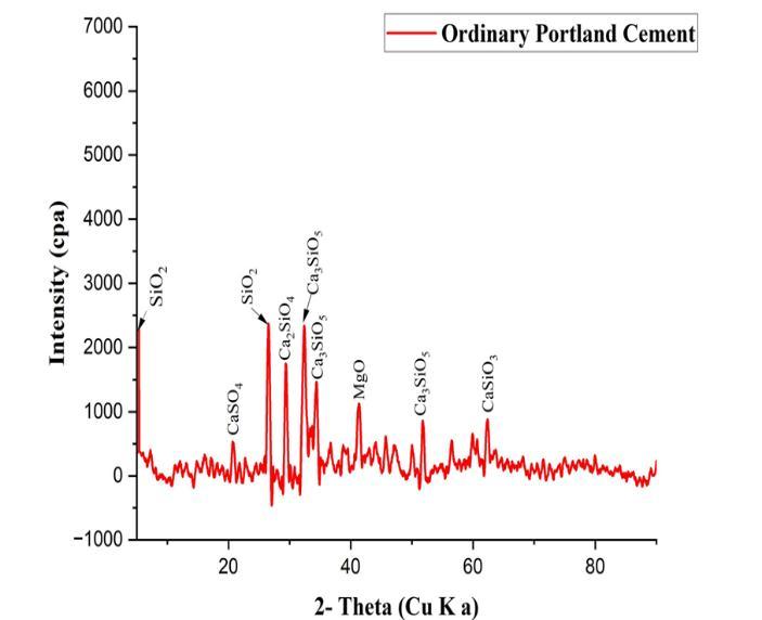 To analyze the chemical structure of materials, XRD Patterns of OPC were plotted. The pointed peaks of graph indicate towards the crystalline nature of OPC. The main peaks of Tricalcium Silicate C3S (Ca3SiO5) Dicalcium Silicate C2S (Ca2Sio4) and Silica (SiO2) were observed, along with it peaks of Gypsum (CaSO4), Magnesia(MgO)werealsoobserved.