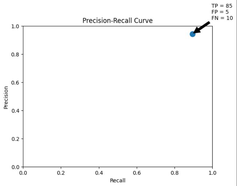 Precision=TP/(TP+FP)=85/(85+15)= 0.9444