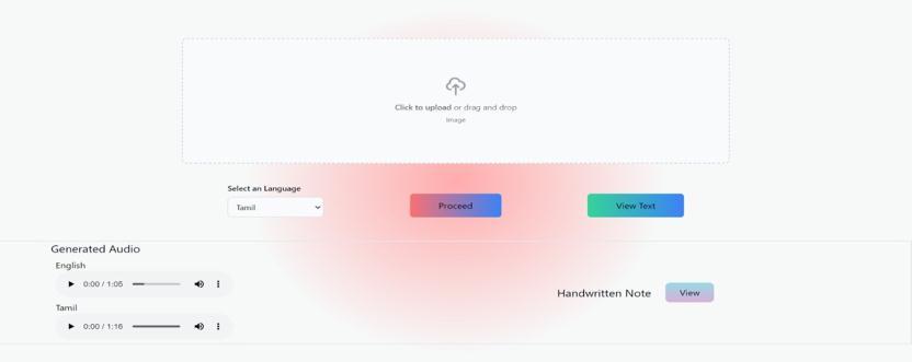 Inthefuture,wecanprolongtheapplicationviaincluding morelanguages,exceptionalfontsandimprovehandwritten notes. Various accents can moreover be added for audio data.Initially,wetakeonlyoneimageatatimeasanenterin thefuturewecanaddamultiplenumberofimagesforpreprocessing.Notonlyimageswecantakeanytypeofvideos andbreakdownintoframesandthatimageobtainedfrom the video can additionally be processed. This will help in makingsubtitles.