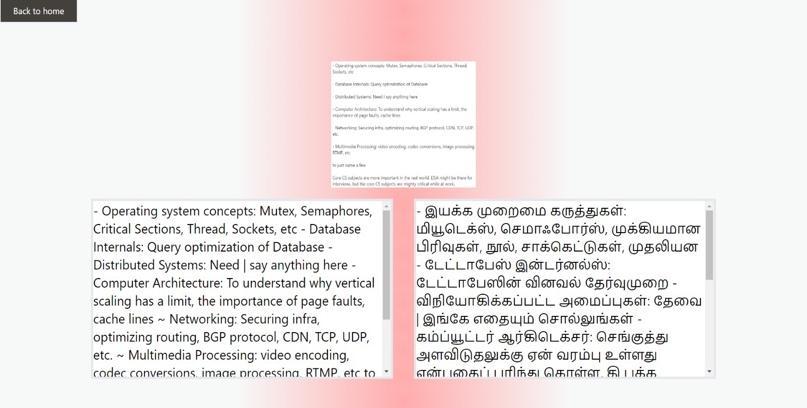 OCR (optical character recognition) is a technology that converts embedded texts from images into a text. Using, Tesseract-OCRlibraryitcanextracttextfromimagesandthat textcanbesavedincloudthatisFirebasecloudstorage.It can take one text input and convert that text into another languagetextbyselectingthelanguagefromdropdownusing thegoogletransAPIprovidedbygoogle.Andwecanalsothe textinFirebasestorage.Inthenextpart,theapplicationis convertingthetextintoaudiobyusinggTTSthatisGoogle texttospeech,saveitinFirebaseanddisplayitonUI(user interface).Andthen,lateritcanconverttextintohandwritten notes by using PyWhatKit library and display it on application.