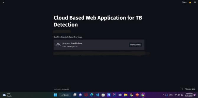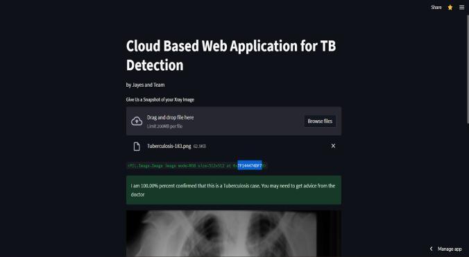 Overall, the cloud-based web application for rapid and precise detection of tuberculosis using SVM can provide a valuable tool for healthcare providers to quickly and accurately identify TB-positive cases and initiate appropriate treatment. The application can help to reduce the burden of TB on global health and improve patient outcomesbyfacilitatingearlydetectionandtreatment.