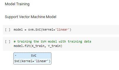 So here weare using support vector machine to train our model for getting best accuracy and also used linear kernel for reduction of our dimensionality of data for classification.