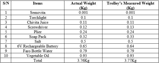 The result from Table 1 was carried out using a standard weight meter to measure the items and compare with the trolleys ability to measure the items. The standard weight meter was calibrated to measure in gram by default, whereas the weight sensors on the trolleys measures items in kg. Items 1 and 2 from the table 4.1 had on them their weight from their manufacturers.Thesestandarditemswereusedinordertocheckthetrolleysweightmeasurementaccuracy.Itisobviousthat thetrolleyfunctionsproperlyinidentifyingtheweightofitemsplacedinit.The20kgweightsensorswereimplementedinthe designtoachievethisfeature.
