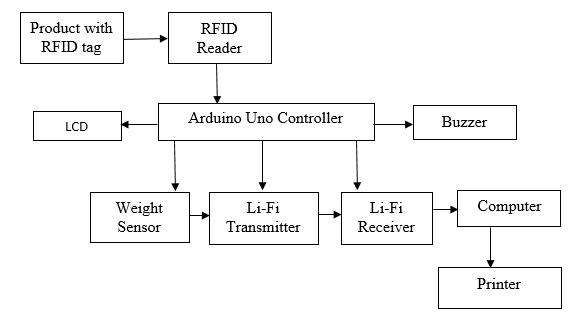 The block diagram in Figure 1 depicts how the building blocks interacts with each other to yield the complete smart trolley system.Theitemswillhave RFIDtagswhichisreadbytheRFIDreader,informationread fromtheRFIDreader isforwarded to the Arduino Uno controller and is displayed on the LCD, the weight sensor helps identify weight of items placed in the trolley and as more items are placed, it keeps weighing the item, it also helps to reduce weight of items removed from the trolley. The buzzer helps with the sound while products are placed in to the trolley or removed from the trolley, Li-Fi transmitterandreceiverutilizeswirelesscommunicationmeanstosendinformationfromthetrolleytothecomputer.TheLiFitransmitterismountedonthetrolley,whiletheLi-Fireceiverisatthecashier’send.Theinformationofitemsplacedinthe trolley can be printed from the computer with the help of a printer which will then serve as the customer’s receipt and clearanceforexitfromthesupermarket.