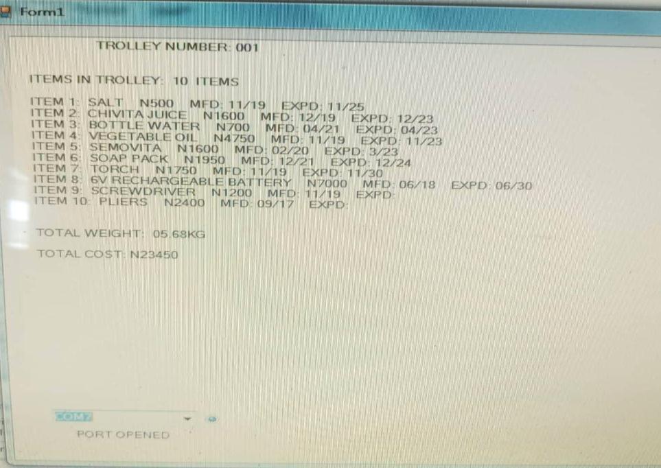 Thedesignelectronicscomponents werecasedsoastoserveasa bettermeansofintegratingitonthetrolley.Thecomplete smarttrolleyisshowninfigure3,wheretenitemswereplacedinthetrolley.Alltheseitemshadtheirinformationdisplayed respectivelyonthetrolleysdisplayinordertoconveniencethecustomerwhileshopping.