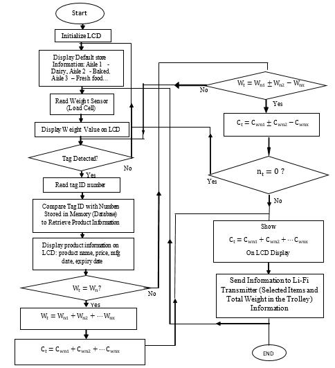Theauthorsin[11]designedasystemsothatwhenanRFIDtagisread,theRFIDmodulebeginstooperateandsendsasignal tothemicrocontroller.TheLi-FimoduleandLi-Fireceivermodulearealsohookedtothemicrocontroller,whichisconnected to a power source that powers the cart. The customer receives information about the products that have been scanned and displayedontheLCD,whilethevoiceboardprovidesinformationabouteachproduct,theKeypadisusedtochoosebetween differenttrolleymodes,andtheparallaxdataacquisitiontool(PLXDAQ)softwareisusedtotransferthedatatoanExcelsheet viaaLi-Fimodule.