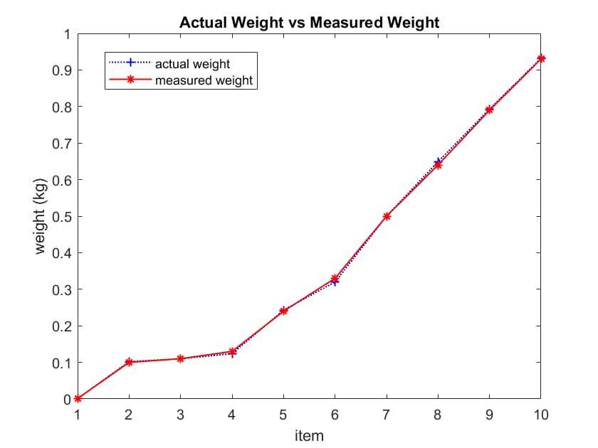 The graph in figure 6 shows the trolley’s measured weight versus the actual weight of items in consideration, and it can be seen that the two plots closely corresponds to each other, so the trolley’s measured weight is fairly accurate and could be reliedupon.