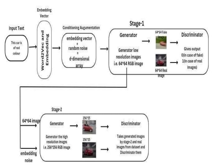 Abstract - Producing good images from descriptions is a challenge in computer vision with practical applications. To address this issue, we propose Stacked Generative Interconnected Networks (StackGAN) to combine the 256×256 real images described in the annotation. The process splits the problem into two phases: Phase-I generates the low-level image by drawing pictures and colours from the text, while Phase-II edits the Phase-I results to create the high image with photorealistic details. . price picture. Conditional magnification is used to improve image contrast and stable GAN training. Extensive testing demonstrates that our development method is better than the state-of-the-art method and proves its effectiveness in creating realistic images based on descriptions. In summary, StackGAN provides a multi-level approach with additional optimization to improve composite images and shows great results in creating high-quality images from text.