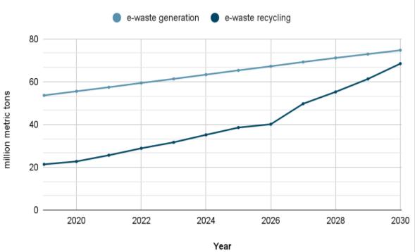 India is one of the up surging economies globally, with rapid industrialization and urbanization leading to a significant increase in e-waste generation. A significant part of the e-waste generated in India is managed by the informal sector, which includes waste pickers, scrap dealers, and dismantlers. The forecast of the e-waste generated and recycled from 2020 to 2030 from various sourcesispredictedasshowninfigure1.