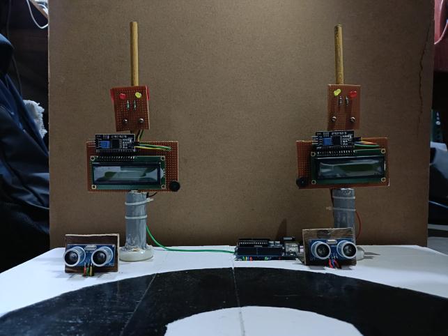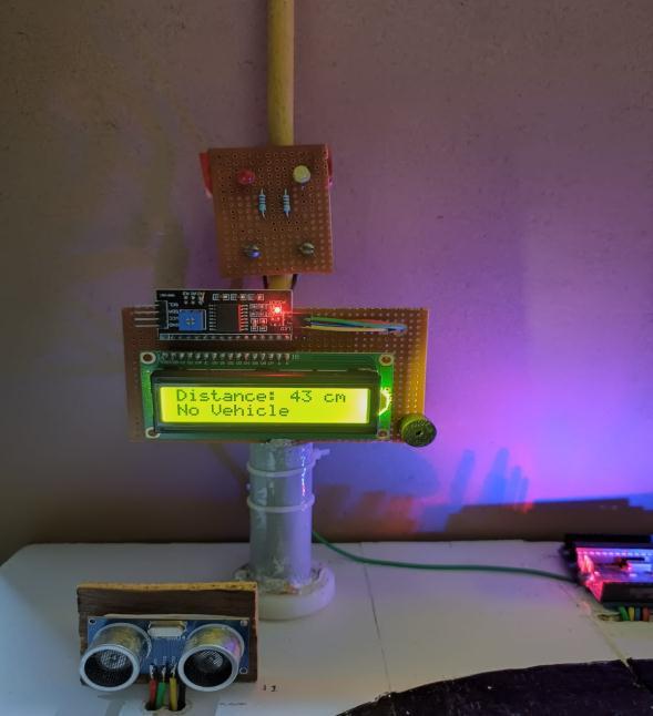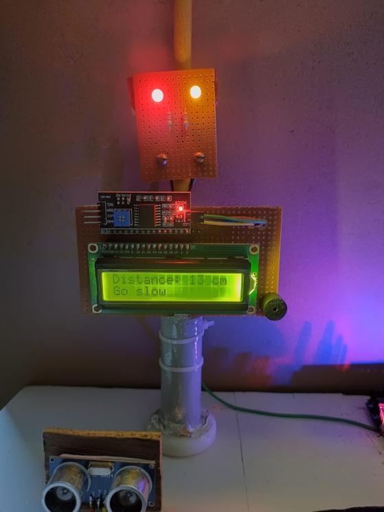 Whenobjectarrivesneartheultrasonicsensor1,itstartsto detect.ThenI2Cmodule1helpstodisplaycontentinLCD display1i.e,“VehicleAhead”.Similarly,whenobjectarrives near the ultrasonic sensor 2, it starts to detect. Then I2C module 2 helps to display content in LCD display 2 i.e, “VehicleAhead”Whenobjectistooclosetothesensoritwill display “Go slow” with red light and when its far it will display“VehicleAhead”withgreenlight.