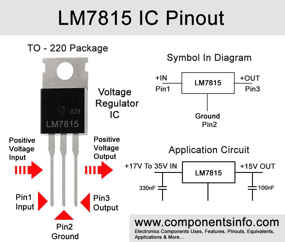 Voltage Regulator L7815: Avoltageregulatorintegrated circuit with a set output voltage of +15V DC is called the L7815.Itbelongstothewell-known78xxseriesofvoltage regulators, which are frequently employed in electronic circuits to produce a steady DC voltage from a fluctuating inputvoltage.Aninputterminal,anoutputterminal,anda groundterminalmakeupthethreeterminalsoftheL7815 device.Theoutputvoltageissetat15VDCwithamaximum outputcurrentof1.5A,whiletheinputvoltagerangesfrom 17Vto35VDC.Todissipatetheextrapowerproducedwhen
