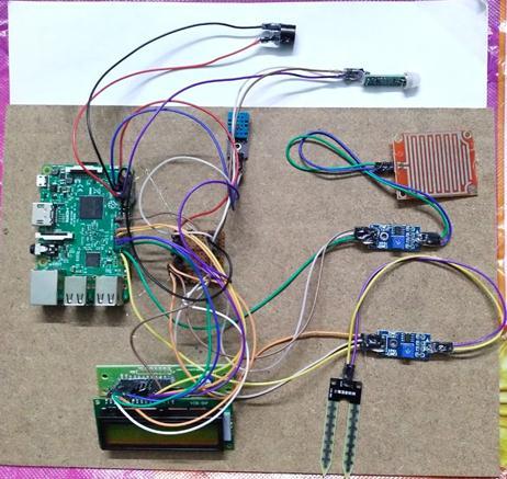In the hardware implementation (as shown in fig 2) we have used the raspberry pi with various sensors like SMS, DHT11,PIR and rainfall sensor including with buzzer. The PIR sensor given the output in digital format whether the objectisdetectedornormal.Andwhenthetemperatureis abovethe38oCthebuzzerwillbeactivated.Theresultand sensor data will be displayed in LCD and app which was connectedthroughthenetwork.