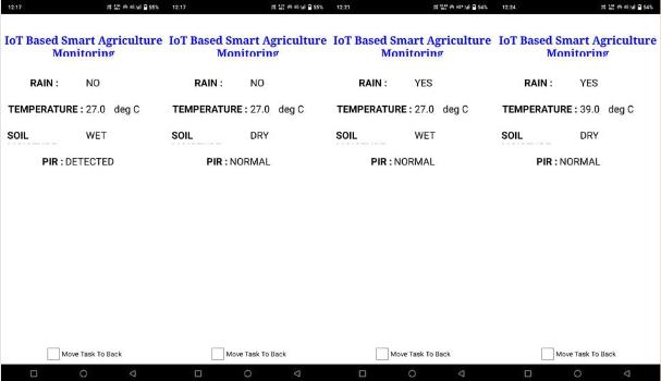 Once the hardware is connected to the phone via a hotspot,open theapplication on the phonewhichconsists of different fields.Changesmade to the sensors in formof heat, moisture, movement etc will immediately reflect on theappandwillproviderealtimechangessmoothly.