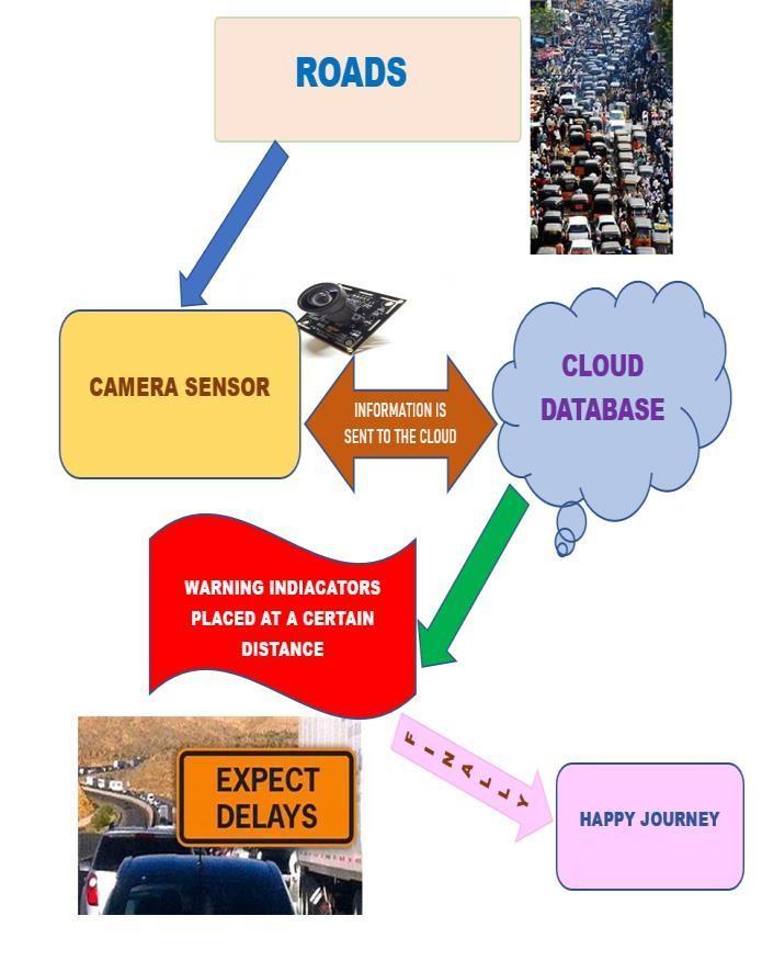 algorithmstodeterminethetrafficdensity.Theinformation isthendisplayedonanLCDscreenlocatedattheroadside. The system is also connected to the cloud to store and analyze data for future use. IoT is employed in practically every industry, and it will be crucial in traffic control. Sensorsand cloud services are used in IOT deployment. However, using all of the sensors will be more expensive financially. Due to the fact that camera sensors will serve astheequivalentofallothersensors,wehavechosennotto use allof the available sensors in this project. Installed in trafficzonesandonhighwaysarecamerasensorsthatuse image processing to detect any changes in the state of the roadandtransferthatinformationtothecloud,whereitis used tosend warning signals to LCD screens located at specificdistances.