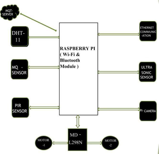 The block diagram shows the functional flow of how the robot works. The vital components of the proposed system include sensors, a control unit, Bluetooth, a wireless camera, and a power supply unit. Bluetooth is used to transfer data and messages. All these sensors are directly connected to the raspberry pi which has a default program in it. The working power for the robotis obtainedfroma batteryconnectedtotheraspberrypi.