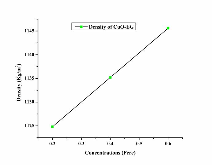 ThevariationofdensityoftheCuO–EGnanofluidatdifferent concentrationshowninFigure5.ThedensiyoftheCuO–EG nanofluid incresed with incresed concentrations. The concentration of tha CuO – EG nanofluid vary from 0.2%, 0.4%, and 0.6%. The valeus of density at 0.2%, 0.4%, and 0.6% were 1124.80 kg/m3, 1135.20 kg/m3 and 1145.60 kg/m3respectively.