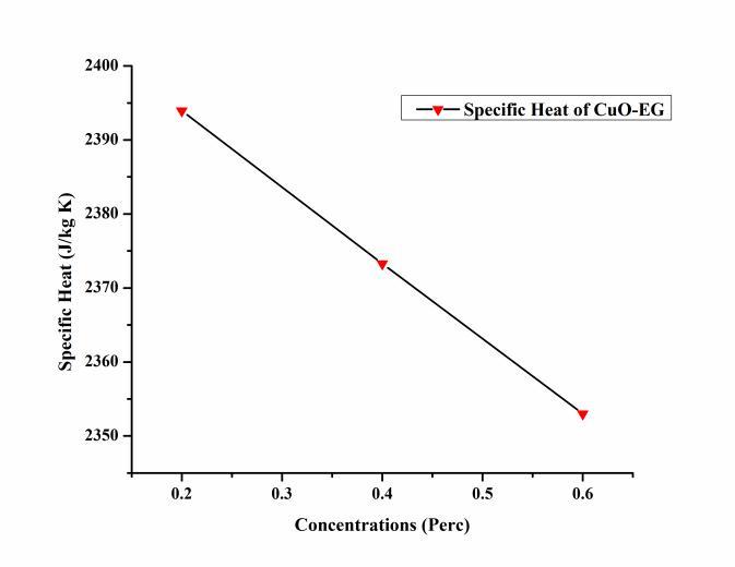 The specific heat of the CuO – EG nanofluid at different concentrationshowninFigure8.Thespecificheat oftheCuO