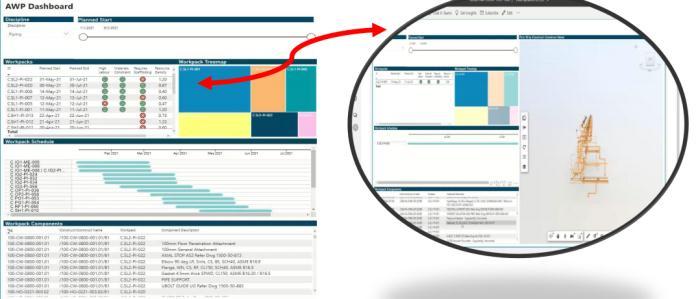 ThedatafromPMISandBIMmodelscanbemadeavailable toprojectmanagementand ownerstounderstandproject progress. The screen shows a plant with work packages dividedbasedonprojectscope.ThePMISwebpageonthe leftisconnectedtoBIMandprovidesalistofpackagesand boxesrepresentingdifferentpartsoftheworks.Clickingona boxprovidesdetailsoftheindividualparts.Thetimelineis also available, filtered by discipline. The portal allows checkingotherdisciplinesaswell.