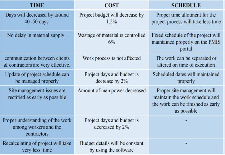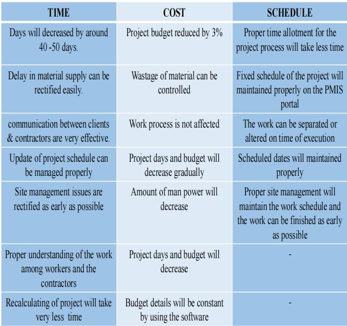 Toachievesuccessfulconstructionprojects,itiscrucial to manage time, cost, schedule, and safety efficiently. By reducing the project duration by 60-80 days and cutting down the budget by 3%, proper time allocation for the project process can be achieved more efficiently. Material supply delays can be rectified swiftly to control material wastage.
