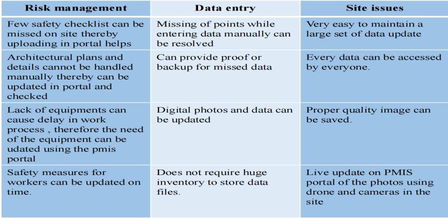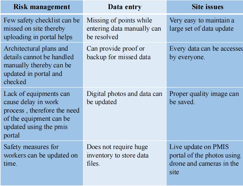 PMIS plays a critical role in construction project managementbyenablingprojectmanagerstomonitorand controlallaspectsoftheproject.UsingPMIS,construction project managers can effectively manage communication among project team members, stakeholders, and clients, optimizeresourceutilization,controlprojectcosts,manage project schedules, identify, assess, and mitigate risks, monitorqualitycontrol,andgeneratereportsandanalytics on project progress, resource utilization, budget performance,andotherkeyprojectmetrics.