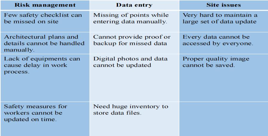 Effective time, cost, schedule, and safety management is critical for construction projects, but various issues can hinderprogress.Delaysinthedesignprocesscanincrease project duration and costs, while delayed material supply can result in schedule changes and material waste. Daily safety checklist updates may be challenging, and poor communicationbetweenclientsandcontractorscanaffect workprocesses.Sitemanagementanddesignissuescanalso require more manpower and impact safety inspections, while a lack of architect collaboration can cause work clashesandlongerprojectrecalculationtimes.