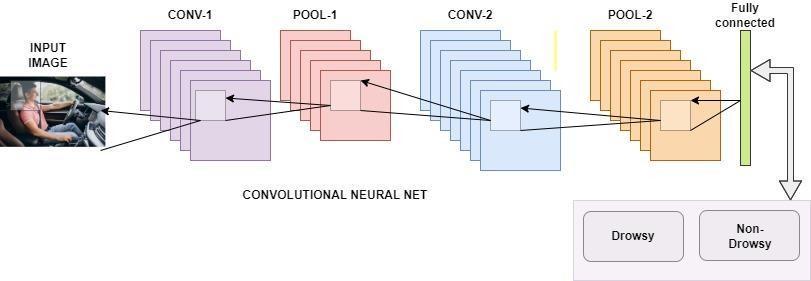 3.5 Convolutional neural network: Aconvolutionalneural networkisusedintheproposedpaperfordriverdrowsiness detection.Itwillcontinuouslyexaminethereal-timeimages extracted from video througha webcam.it will predict probabilities to calculate the stateof the driver if the set threshold value found to be less than the prediction accordingtotheEARvaluetheeyes arefoundtobeclosed. thealarmwillbestart