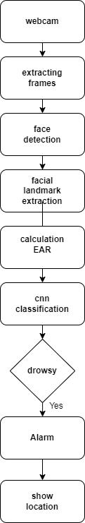 Firstly a webcam is used for recording real-time video of the driver. the webcam is placed in front of the drivertocontinuouslycapturetheimageofthedriver.The frames are extracted from the video using OpenCV.it is a real-time computer vision library. haar cascade algorithm used to detect faces from the frames. After face detection, faciallandmarkshavebeenextractedbyusingliblibrary.the facial landmarks are then used to compute the EAR eye aspectratio..afterthisconvolutionalneuralnetworkisused for classifying the state of the driver. the EAR value is comparedwiththethresholdvaluethatistakenas0.2inthe proposed system if EAR value becomes less than the thresholdvalueItisfoundthatthedrowsinessisdetectedas eyesarefoundtobeclosed. Thenanalarmwill besent to alertthedriver.Afterthatthelocationofthedriverwillbe showntothedriver.