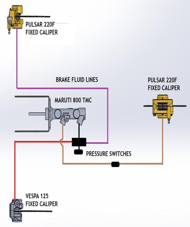 Brakesystemisofhighpriorityinthevehicleasanybreach ormiscalculationcandirectlyaffectthesafetyofthedriver. Withkeepingthesameperspectiveinmind,acombinationof OEMandself-designedcomponentsisused,tokeepthebrake systemasreliableaspossible. Designeda Front/Rearsplit circuit with inboard braking on the rear side. A 2 port Tandemmastercylinderwiththeborediameterof19mm andfixedtypebrakecalipersofborediameter30&32mmas theyarecompact,lightweightanddurableisused Thebrake discsaredesignedof160mminthefrontand190mminthe rearthatarecapableoftransmittingthebraketorqueaswell asdissipatingtheheatthatisgenerated.Keepinginmindthe ergonomicconsiderationswhiledesigningthepedalwhich alsosustainsrepeatingcyclesofpanicbrakingasshownby theanalysis.Therefore,byhavingabrakingtorquewhichis morethantherequiredtheoreticalvalue,ATVwillbeeasily abletostopwithinadistanceof4.9m.