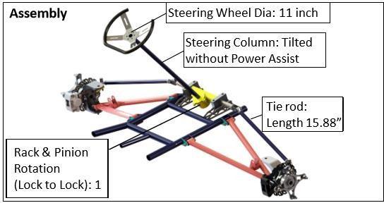 Theassemblyconsistsofsteeringwheel,steeringcolumn, rack & pinion, tie rods and steering arms. Steering wheel (increaseddiameter thanpreviousvehicleforreductionin steering effort) is made from aluminum pipes bent using handbendingandweldedtogetherbyTIG welding.Steering column is made from AISI 4130 tube with 2mm thickness. 20MnCr5isselectedforrackandpinionandmanufactured usinggearteethcuttingTierodsweremadefromAISI4130 tubesofthickness2mmandsteeringarmsweremadefrom MS(MildSteel)usingCNClasercutting