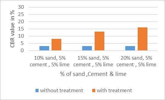 IntheCaliforniabearingratiowehavetaken5kgsamplefor eachtestweconducted4testinCaliforniabearingratio(soil, Soil+10%sand+5%cement+5%lime,Soil+15%sand+5% cement+5% lime, Soil+ 20% sand+ 5% cement+5% lime) comparethemwitheachother.Firstweovendriedthesoil for 24 hours after 24 hour cooled down the soil in room temperaturefor30minutesthenmixeditwithdesiredwater thenfixedtheextensioncollartothetopthemoldandthe vaseplatetoitsbottom.Afterinsertthespacerdiscoverthe baseandthenputafilterpaperonthetopofthespacedisc and compact the soil in the soil the we use heavy compaction. We used 5 layer of soil in mold compacted it with 56 blow for each layer then removed the excess soil