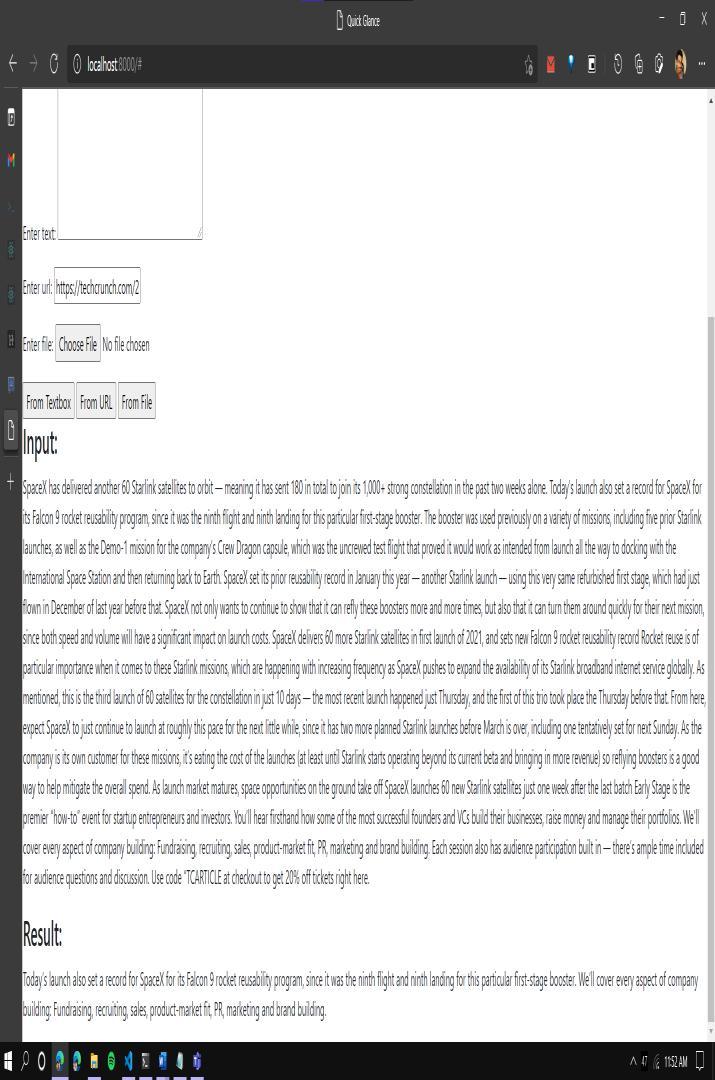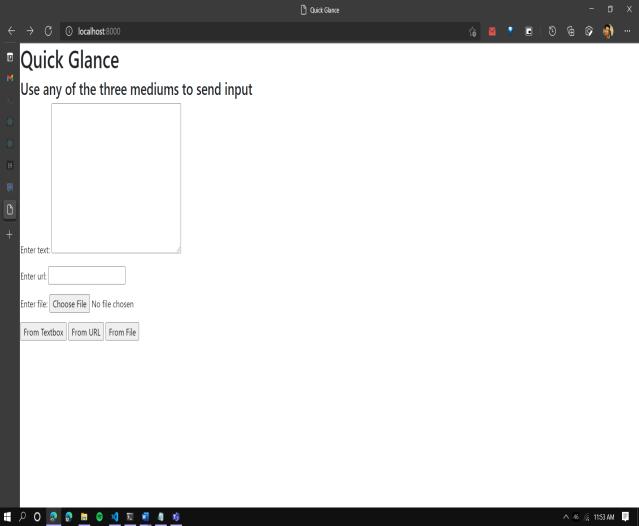 Quick Glance Text summarization application provides Graphical User Interface on the Web using Django Web Framework. Inputfromusercanbe senttotheapplication asshowninFigure2in3differentways.