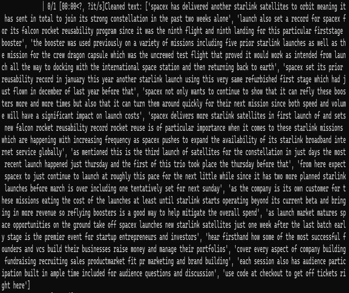 After the text has been converted to sentences, it must be cleaned.Itincludesremovingthepunctuation,removingthe needlessspaces,convertingalltexttolowercase,removing thenumbertokens.Theprocessedtextwillbeforwardedto furthersteps.ThecleanedtextisshowninFigure3.