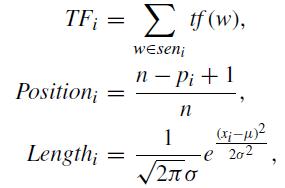Liu[6]proposedasimpleweighting-basedunsupervised extractivesummarizationmethod.Forthe i-thsentenceina document(Si),theycalculatedsentencescoresbyleveraging term frequency, similarity, positional information, and sentencelength.Inparticular,termfrequency,positionscore, andsentencelengthscorearecalculatedasfollows: