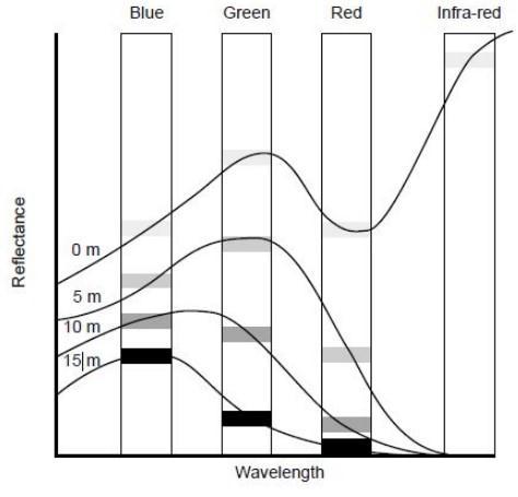 Attenuation is a phenomenon whereby the intensity of light passing through water decreases exponentially as depth increases, which affects remotely sensed data from aquaticenvironments.Inthevisiblespectrum,thedegreeof attenuation varies depending on the wavelength of electromagneticradiation,withlonger-wavelengthredlight attenuatingfasterthanshorter-wavelengthbluelight.The separabilityofhabitatspectradecreasesasdepthincreases. Despitethesamesubstratum,thespectralsignatureofsand at2metersdepthcandiffersignificantlyfromthatat10-20 metersdepth.Infact,at20meters,thespectralsignatureof sandmayresemblethatofseagrassat3meters