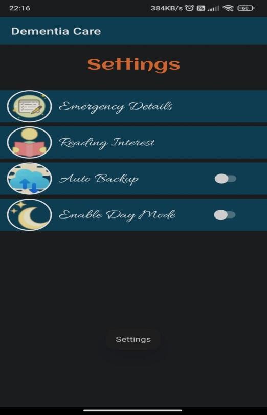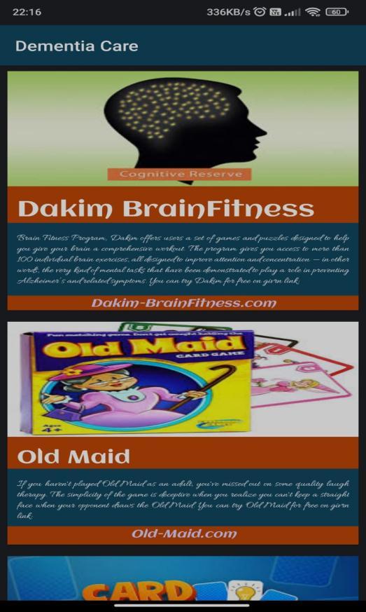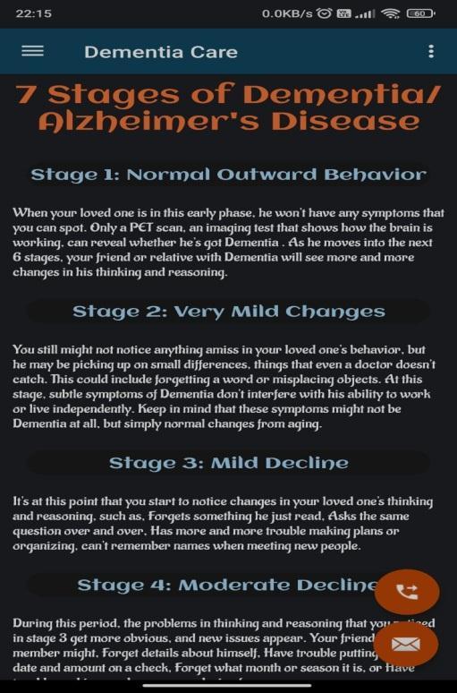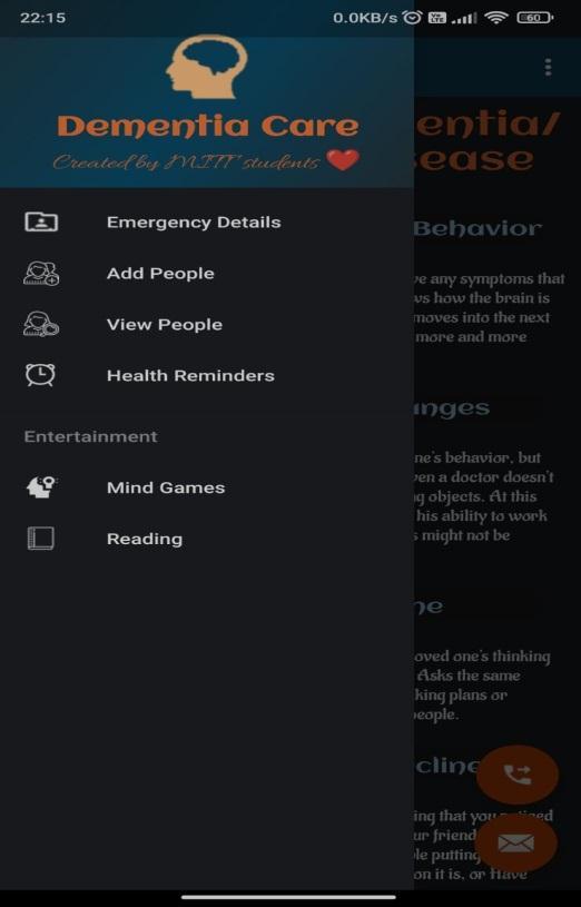 DementiapatientswillprofitfromanSmartphone app. The Dementia is a disorder which manifests as a set of related symptoms, which usually surfaces when the brain is damaged by injury or disease. The symptoms involveprogressiveimpairmentsinmemory,thinking,and behavior, which negatively affect a person's ability to function and carryout everyday activities. Major problem with Alzheimer cases would be to help them with diurnal chores. Alzheimer care targets all similar problem and helps to get all features under one app. The being system hasoperationswhichareconfinedonlytoultra expensive druggies and high- end Smartphone The operations had only features of storing particular information in a textbook format and could have only limited information Alzheimer's disease is a degenerative kind of dementia that affects memory and thinking abilities as well as the capacitytoperformeventhesimplesttasks.Itaffects10% of people worldwide who are 65 years or older .The patient's long-term memory is still functional in the early stages,althoughrecentinformationliketimeanddaymay be forgotten. The disease also has a strong impact on the family members who must endure heartbreaking emotional experiences as a result of seeing an elderly parent or spouse in such a state. We consequently made thedecisiontodevelopanapptoassistcareersandfamily members in keeping the patient mentally active and thereby assisting with brain workouts Damage to your brainresultsindifferentsymptoms,dependingonthearea of your brain affected. Some dementias aren’t reversible and will worsen over time. Other dementias are due to other medical conditions that also affect your brain. Anothergroupofhealthissuescanresultindementia-like symptoms. Many of these condition treatable, and the dementiasymptomsarereversible.