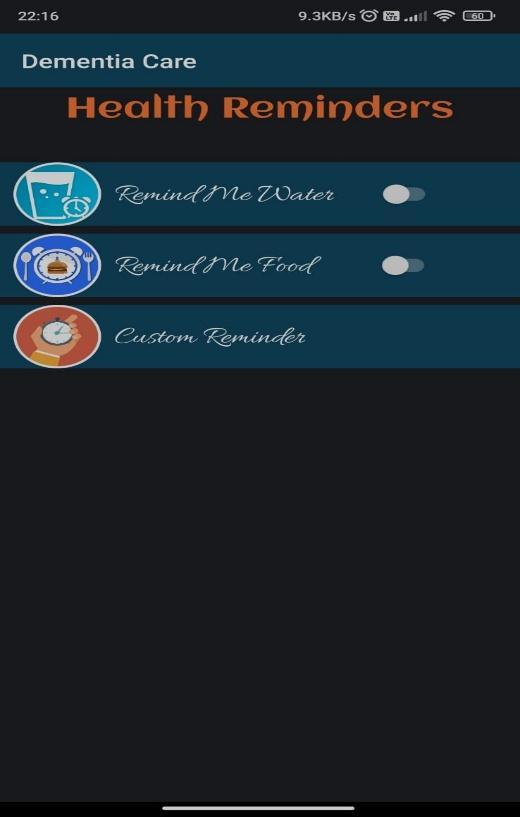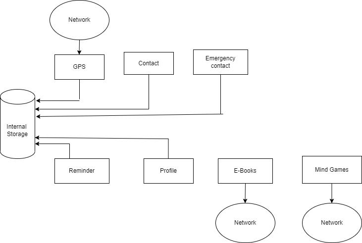 Someofthemoduleswillbeconnectedvianetwork.All thedatawillbestoredtoInternalStorageoftherespective devices.Usercanuselocationinordertofindtherewayto home.Usercansetdailytasksandsetremindertoperform day to day activities efficiently without the help of caretakers.