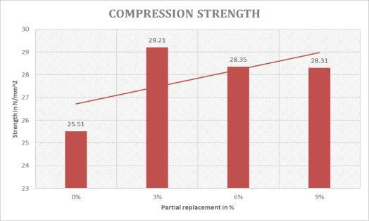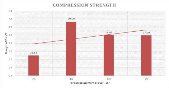 The compressive strength of concrete blocks with partial replacement of fine aggregate by biodegradable materials (SCBP, ESP, and reinforced with jute fibres) at 28 days is depictedgraphicallyinFig.4.1SCBP,ESP,(SCBP+EGP),and &jutefibre.Forallpercentagesofmixturesupto4-8%,the concrete'scompressivestrengthisenhanced.