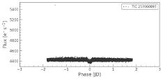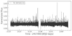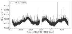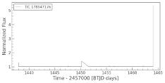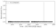 This believed exoplanet is a gas giant which orbits an Ftypestar.Itsmassis0.67Jupiters,whichtakes3.7daysto complete one orbit of its star, and is 0.051 Astronomical Units from its star. Its finding was announced in 2021. This exoplanet was also detected by the Transit method. Its TIC ID is 257060897. Downloading the lightcurve into ourtargetpixelfileandplottingit,wegetfollowingplots: