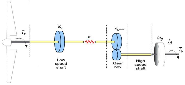 Thedynamicsofawindturbinearefrequentlyrepresented usingatwo-massmodel,asin[13].Whatdistinguishesthe two-massmodelofthewindturbinefromothermodelsis thebenefitofitscontrollers'universaldesign,whichcanbe applied in wind turbines of various sizes. The two-mass modelincorporatesthewindturbine'sadaptabilityaslong as the modes are present [14]. Equation (6) gives the mechanicalmodelofatwo-masswindturbine