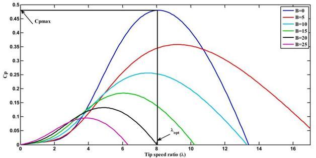 Fig -1:showstherelationbetweenCpandλfordifferent pitchangles.Themaximumvalueofthepowercoefficient, ≈0.48,isobtainedatβ=0°andλ= ≈8.1.