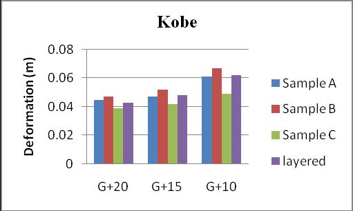 Fromchart-09itisobservedthatdeformationinsoilforKobe ismaximuminG+10buildingwhichis0.065mforsampleB. SampleBhavemoredeformationinallbuilding.Astheheight of building goes down deformations are increases. For all buildingsampleCisshowslessdeformationtheanyother sample.Deformationinlayeredsoilisnearlyequaltosample A