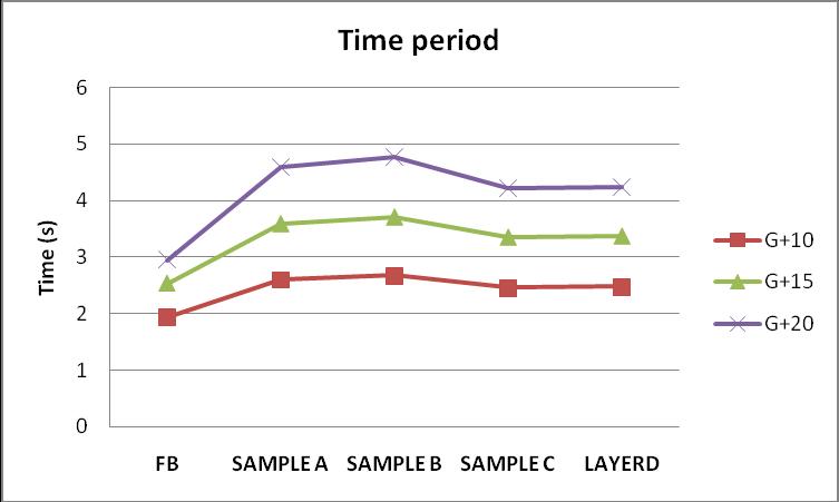 Thefundamentaltimeperiodofstructureforallfourcasesof fixed and flexible base are observed that the effect of soil foundation results in increase of fundamental time of structures. From the analysis G+10 model time period increasearound34%asbaseconditionchangesfromfixedto flexibleandincreasesas27%forlayeredsoil.Similarlyfor G+15 it is increase by 41%, 46% and 32% for sample A sample B and sample C respectively. For layered soil conditionitisobservedthat33%.InG+20modeltimeperiod increasesby55%,61%and43%forsampleA,BandCresp. For the layered soil time period increases by 44% is observed.Amongallsoilsamples,sampleChaslowervalueof incrementinalltypeofstructures